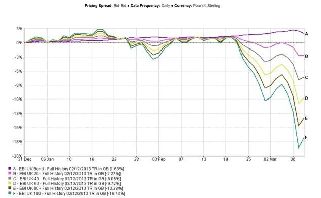 This first chart shows how our lowest risk portfolio (EBI UK Bond) has performed since 1st January when compared with our highest risk portfolio (EBI UK 100). The dramatic difference in fortunes is plain to see, with the Bond portfolio actually increasing through most of this coronavirus scare (well, so far at least).